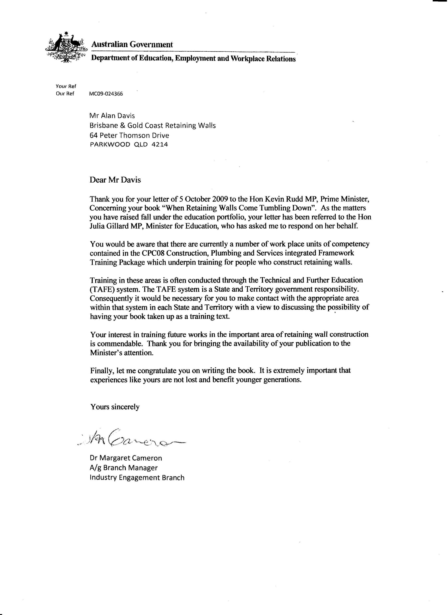 Your interest in training future works in the important area of retaining wall construction is commendable. Thank you for bringing the availability of your publication to the Minister’s attention.